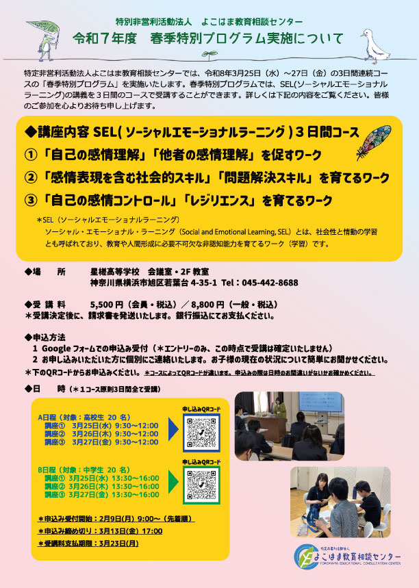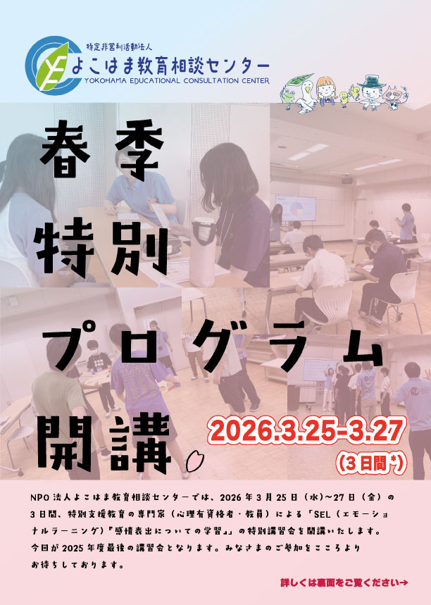 臨時休業のお知らせ 2026-02-16 | お知らせ いつも、よこはま教育相談センターをご利用いただき誠にありがとうございます。 勝手ながら、3月14日(土)は臨時休業といたします。ご相談等のご予約は改めてご連絡いただきますよう、よろしくお願い申し上げます。